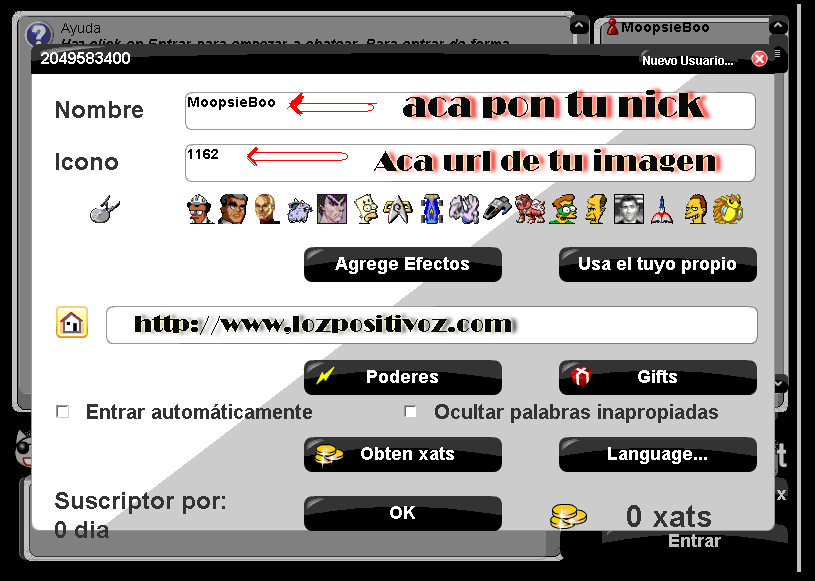 2do. Paso : Ahora Le Das Click En El Muñeco Primero y Te Sale Esta Ventana Ahi Podras Poner Tu Nick Y Escoger El Avatar A Usar.....y luego Pones ok.. |